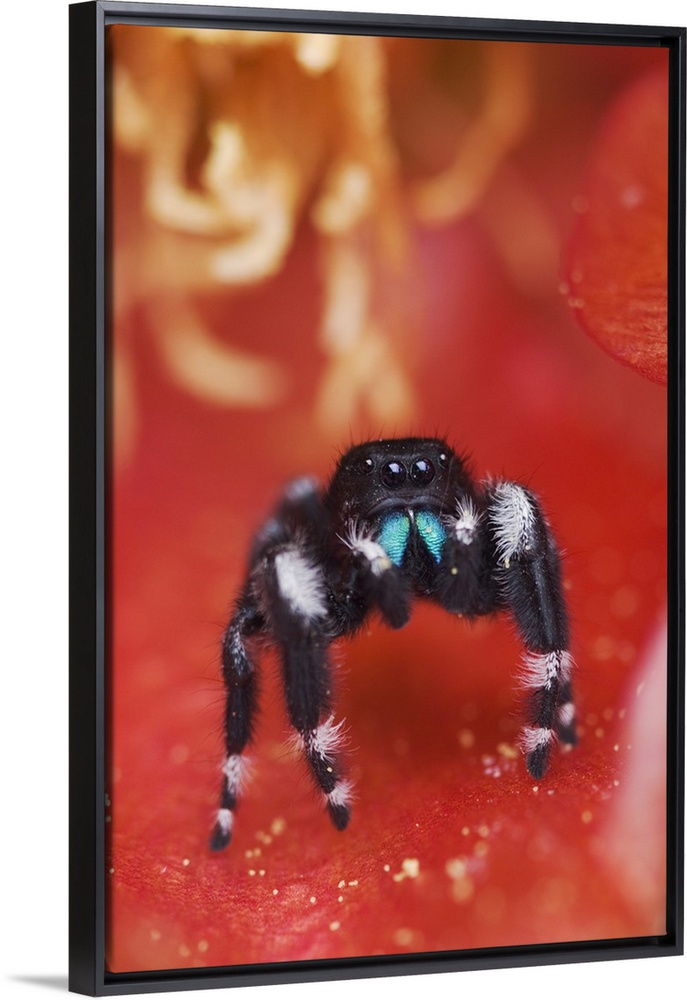 <p>Daring Jumping Spider, Phidippus audax, adult in Texas Prickly Pear Cactus (Opuntia lindheimeri) blossom, Uvalde County, Hill Country, Texas, USA, April 2006</p>