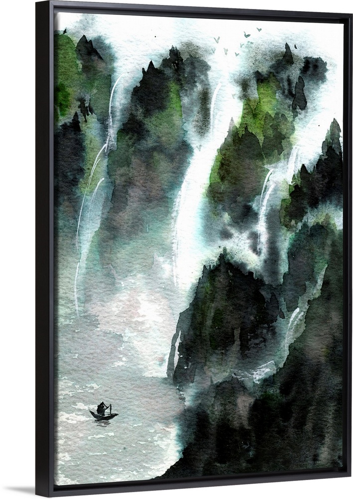 <p>Chinese watercolor drawing of a man in a boat on a lake surrounded by mountains and waterfalls.</p>