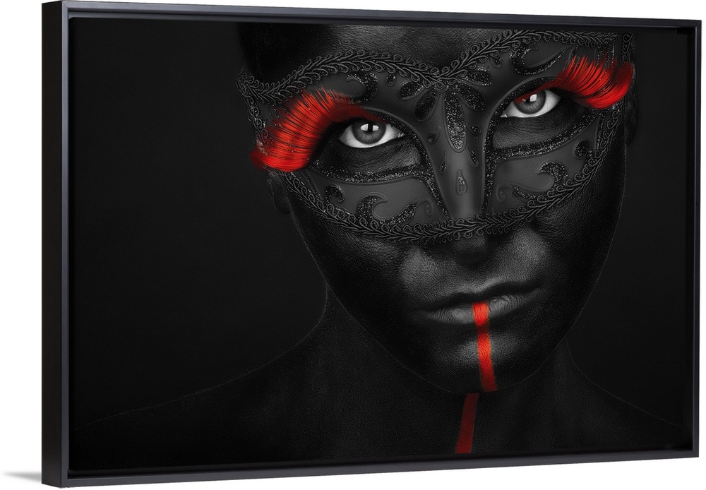 <p>Portrait of a model with black body paint and bright red eyelashes.</p>