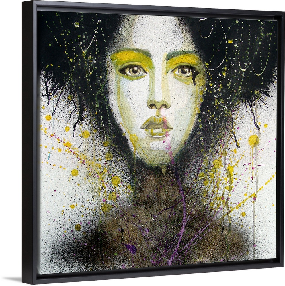 <p>Contemporary watercolor portrait of a woman with darkness all around her and yellow make-up around her eyes.</p>