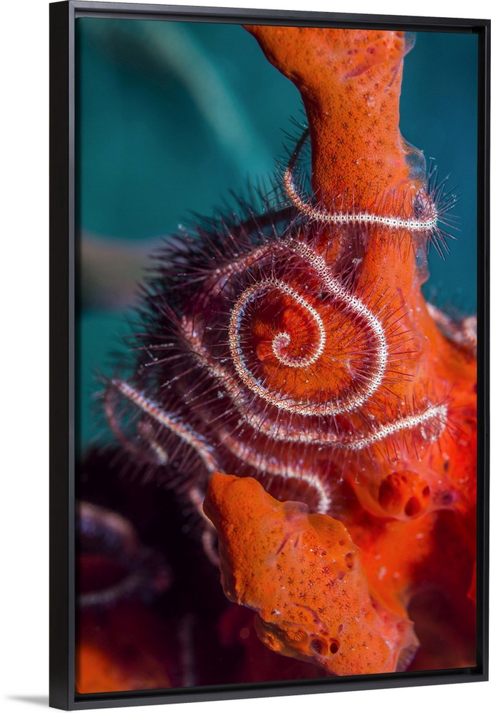 <p>Dark red-spined brittlestar (Ophiothrix purpurea) on coral. Brittlestars are echinoderms and are related to starfish. Ophiothrix sp. brittlestars are found worldwide, from tropics to Arctic and Antarctic regions. Photographed in Tulamben, Bali, Indonesia.</p>