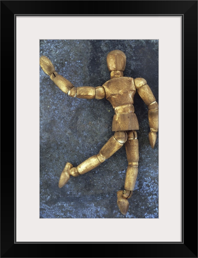 <p>Dark stained wooden mannequin lying on tarnished metal sheet as if running skipping dancing or waving</p>