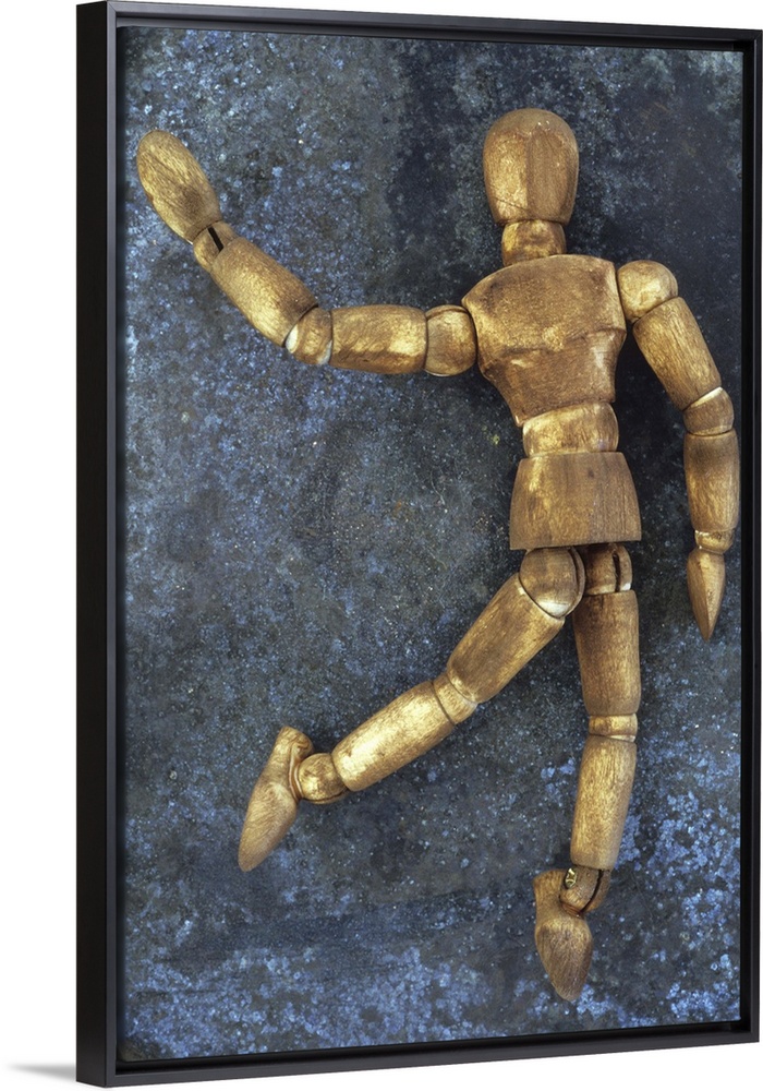 <p>Dark stained wooden mannequin lying on tarnished metal sheet as if running skipping dancing or waving</p>