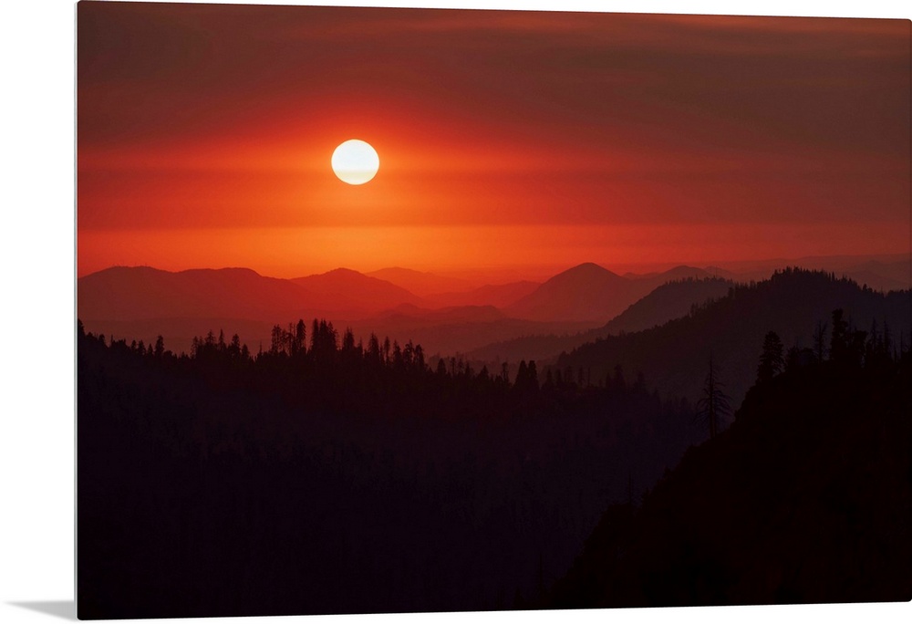 <p>View of a darkened red sky in Sequoia National Park, California.</p>