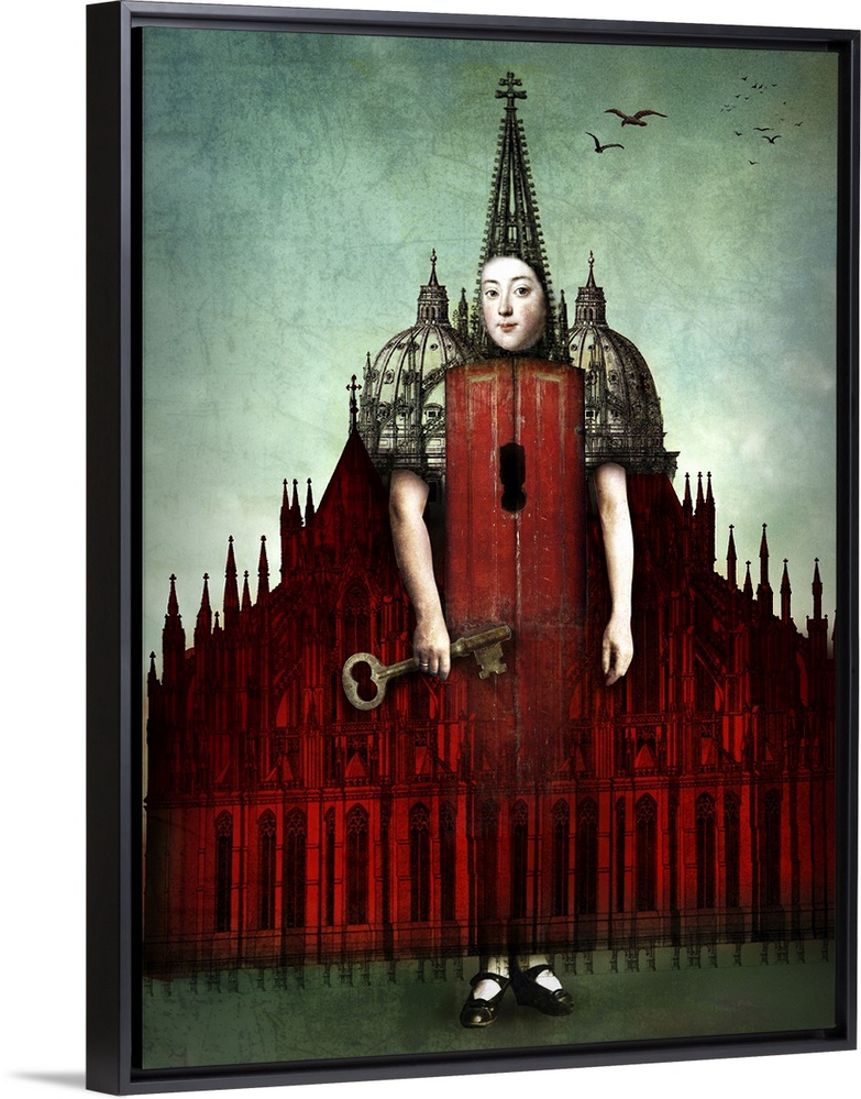 <p>A person with a big key materializing from a large red castle.</p>