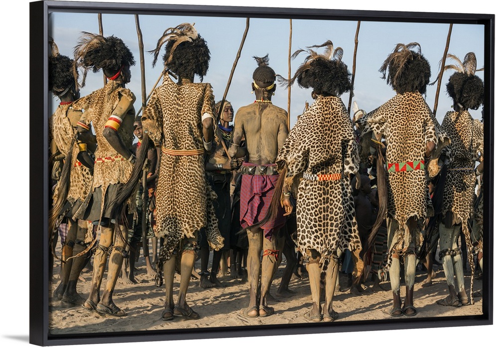 <p>Dassanech men and their wives dressed in ceremonial regalia participate in a Dimi dance, Ethiopia.</p>