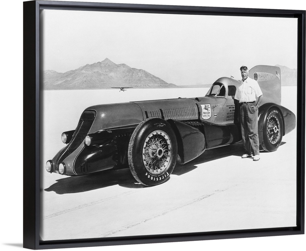 <p>David Abbott 'Ab' Jenkins and the Mormon Meteor III on the Bonneville Salt Flats, c. 1940. Meteor III was built in 1937 to handle the large Curtiss Conqueror airplane engine. It set a 24 hour record of 161.180 mph in 1940 that held until 1990.</p>