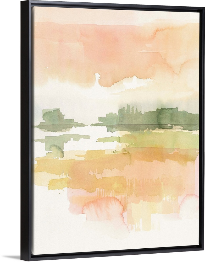 <p>Watercolor painting of a simple landscape in soft pink morning light.</p>