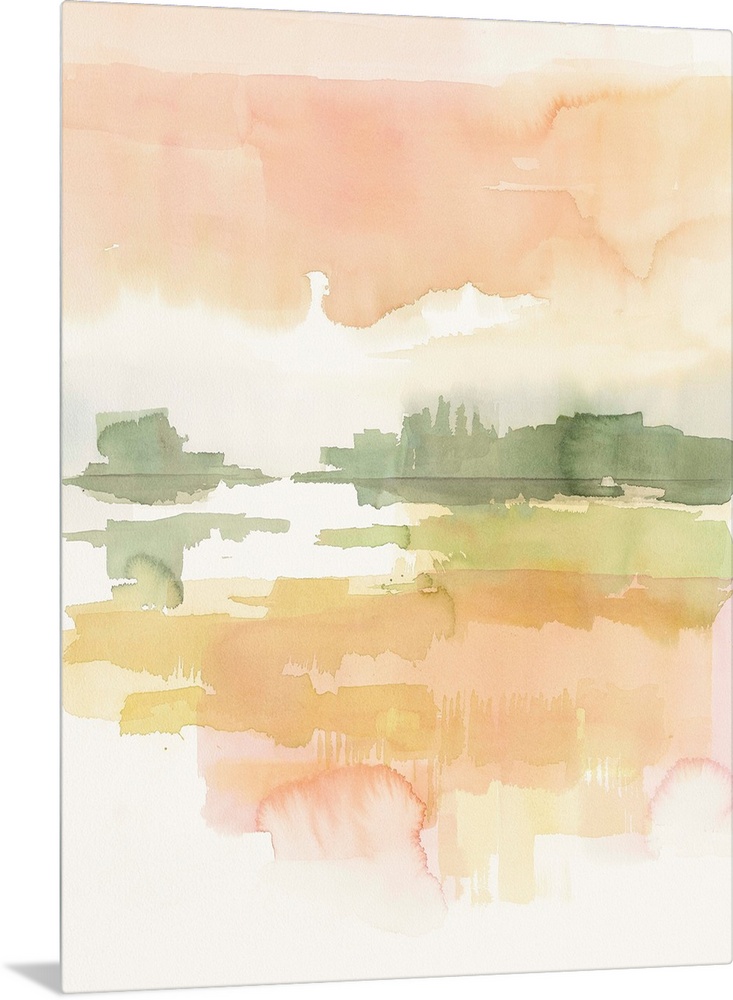 <p>Watercolor painting of a simple landscape in soft pink morning light.</p>