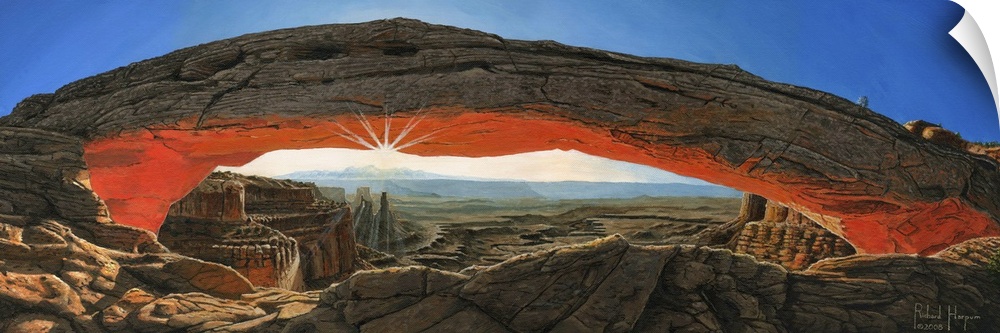 <p>Contemporary painting of a massive natural rock arch in a desert overlooking a vast rocky landscape.</p>