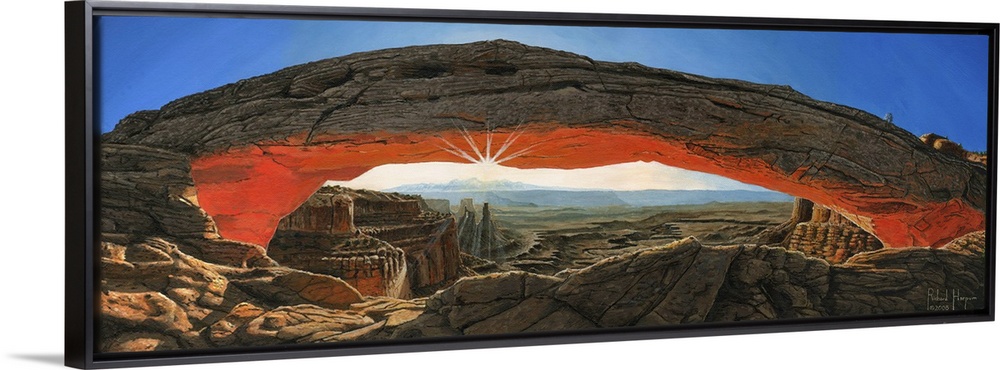 <p>Contemporary painting of a massive natural rock arch in a desert overlooking a vast rocky landscape.</p>