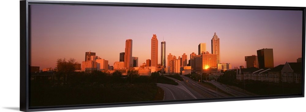 <p>Giant, horizontal photograph of the sun rising over the Atlanta skyline, several roads and a row of buildings can be seen in the foreground.</p>