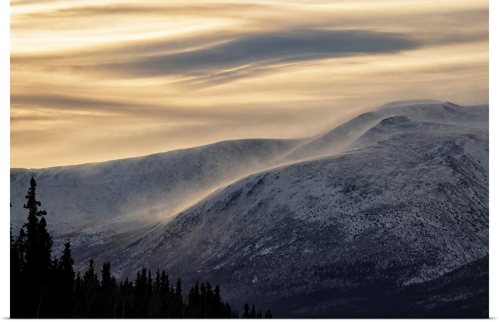 <p>Wind and dawn create a stunning scene during the Yukon's spring. Wind whips up spindrift as beautiful clouds sweep across the tops of the mountains, Haines Junction, Yukon, Canada</p>