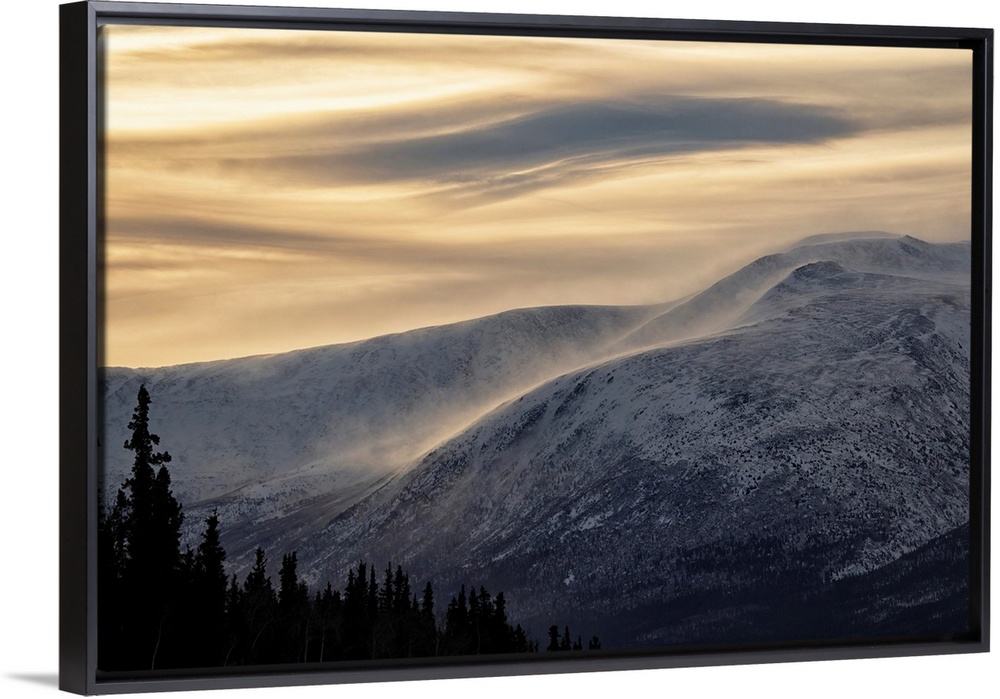 <p>Wind and dawn create a stunning scene during the Yukon's spring. Wind whips up spindrift as beautiful clouds sweep across the tops of the mountains, Haines Junction, Yukon, Canada</p>