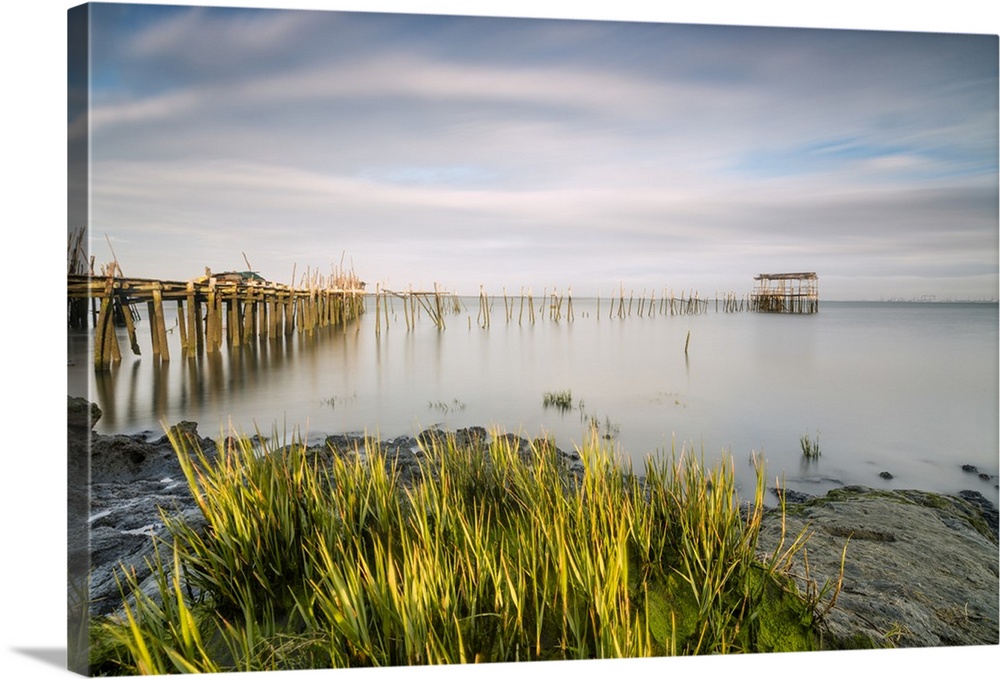 <p>Soft light of dawn on the Palafito Pier, Carrasqueira Natural Reserve of Sado River, Alcacer do Sal, Setubal, Portugal</p>