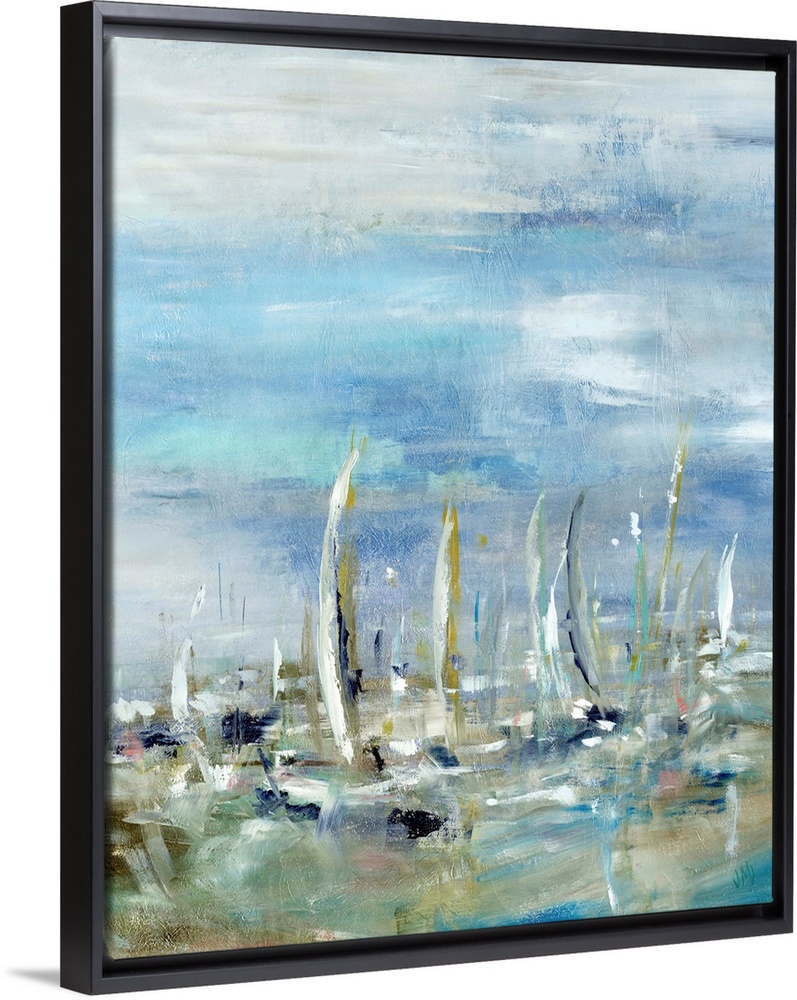 <p>Abstract painting of sailboats in the ocean on a cloudy day. The boat shapes are created from varying brush strokes.</p>