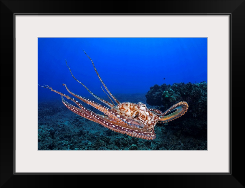 <p>This view shows the eight armed cephalopod free swimming in mid-water, Day octopus, (Octopus cyanea), Maui, Hawaii.</p>