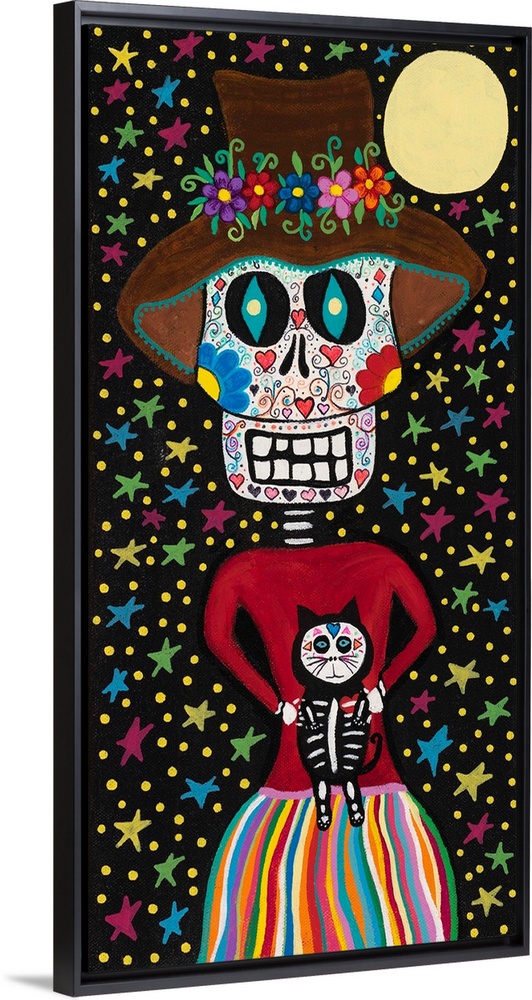<p>Painting of a calavera girl with a matching cat in a pretty dress and hat with a starry sky.</p>