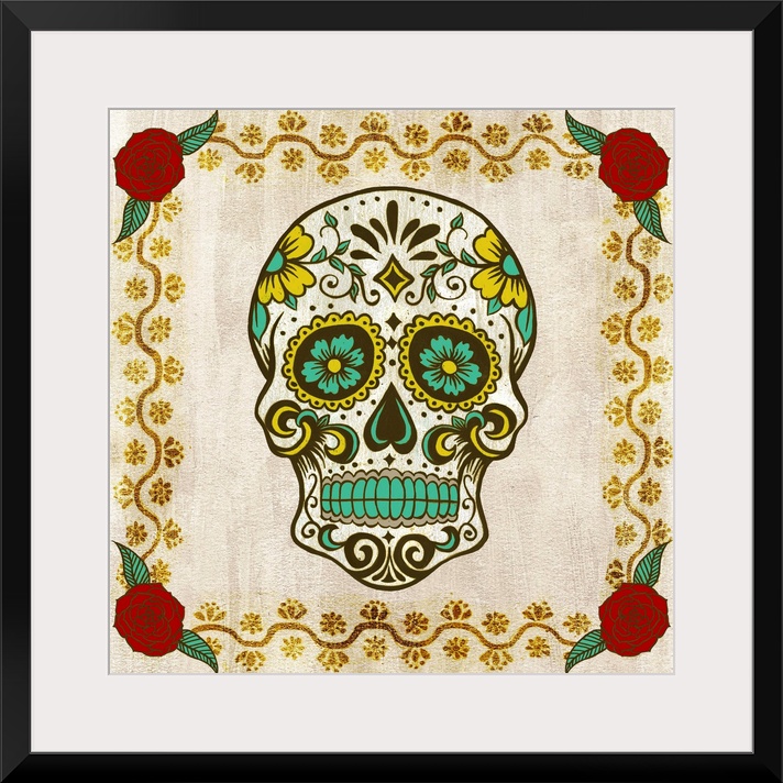 <p>Decorative art with a playful illustration of a Dia De Los Muertos skull on a square background with flowers in each corner.</p>