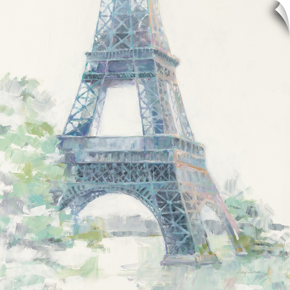 <p>Contemporary painting of the bottom part of the Eiffel Tower made with pastel hues on a white, square background.</p>
