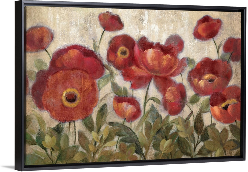 <p>Soft, dreamy contemporary painting of a group of round poppies in a garden with short leaves, on a pale neutral background.</p>