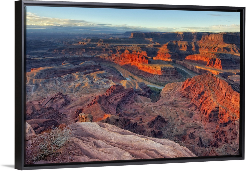 <p>Large photo on canvas of red rock formations in Utah bathed in sunlight from a rising sun.</p>