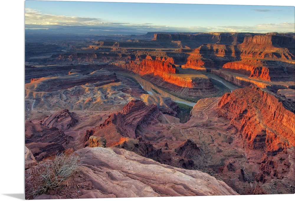 <p>Large photo on canvas of red rock formations in Utah bathed in sunlight from a rising sun.</p>