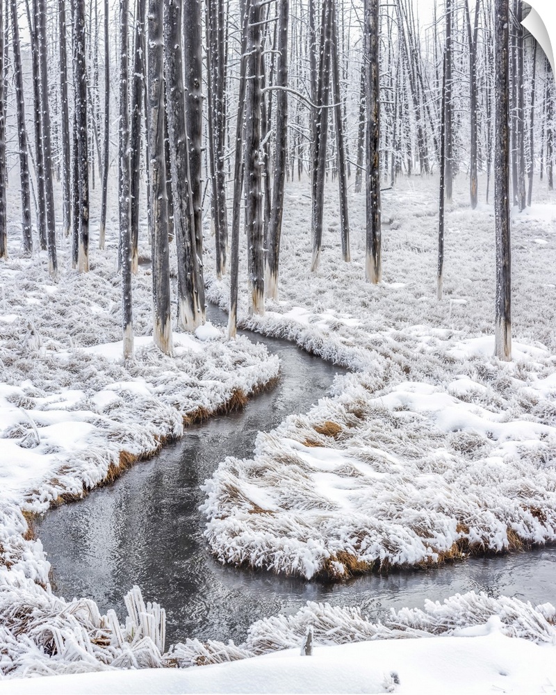 <p>Dead lodgepole pine trees (Pinus contorta) with a thermal runoff channel in the Lower Geyser Basin, also known as bobby sox trees due to the white, mineral deposit residue left behind when the water evaporates, with frost covered marsh grasses in winter Yellowstone National Park, Wyoming, United States of America</p>