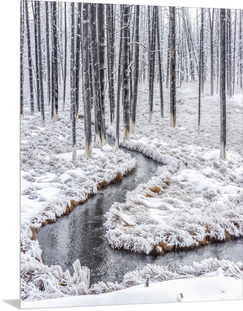 <p>Dead lodgepole pine trees (Pinus contorta) with a thermal runoff channel in the Lower Geyser Basin, also known as bobby sox trees due to the white, mineral deposit residue left behind when the water evaporates, with frost covered marsh grasses in winter Yellowstone National Park, Wyoming, United States of America</p>