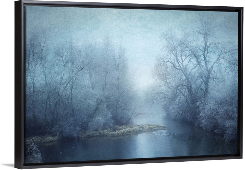 <p>Blue toned photograph of a calm lake surrounded with winter trees.</p>