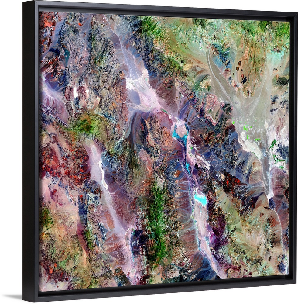 <p>Death Valley, California, USA, satellite image. This is Death Valley National Park, consisting of desert valleys (pink) and salt pans (blue), surrounded by mountains topped by forests (green). Death Valley is one of the hottest, driest places on Earth. The bottom of the valleys are 86 metres below sea level, receive around 5 centimetres of rain a year, and temperatures often exceed 38 degrees Celsius. This image shows an area about 120 kilometres across. It combines data obtained by the Landsat 7 satellite's Enhanced Thematic Mapper Plus sensor on 11 June and 20 July 2000. Courtesy of NASA.</p>