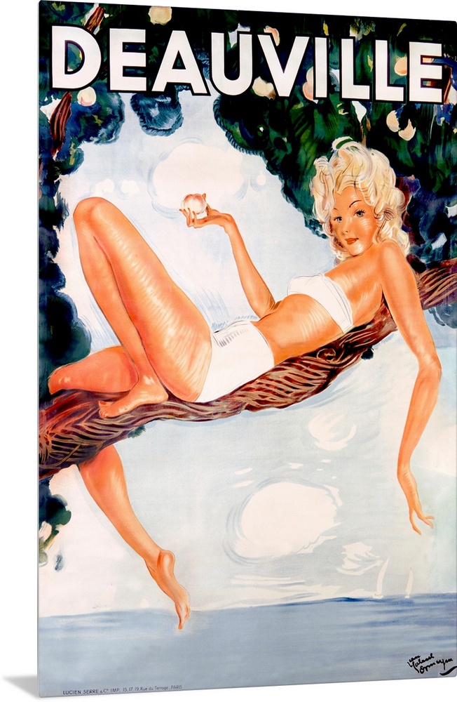 <p>A painting of a blonde bikini wearing pin-up style woman holding fruit while lounging in a tree above the water.</p>