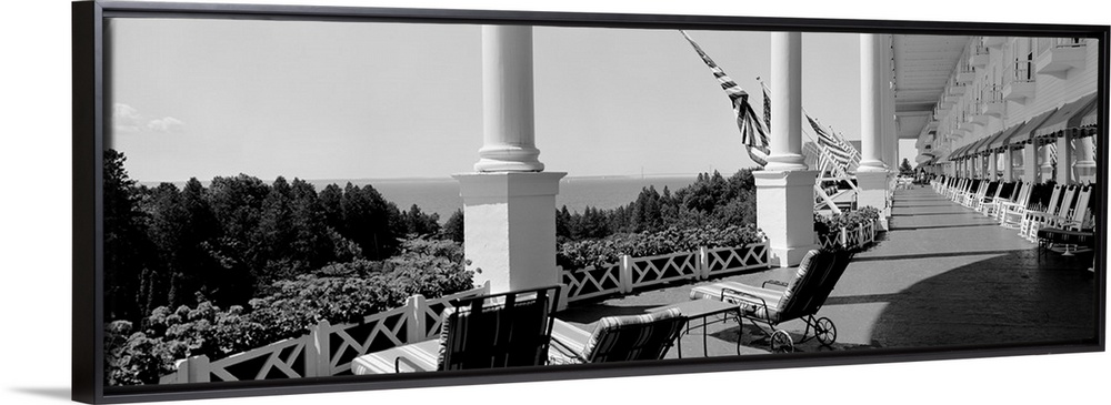 <p>Giant landscape photograph looking down the outdoor balcony of the Grand Hotel as it overlooks the tree tops on Mackinac Island, Michigan.</p>