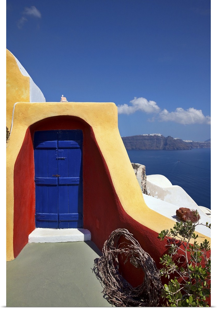 <p>Close up vertical of deck with blue door and orange and red siding and ocean view in the village of Oia in Santorini, Greece</p>