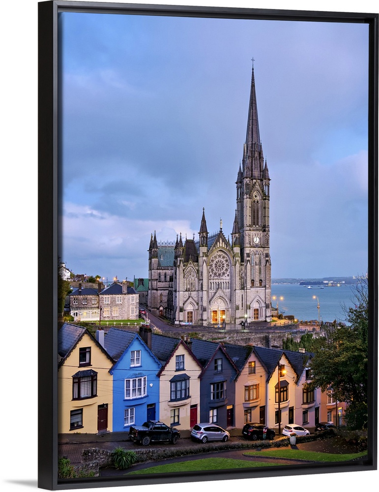<p>Deck of Cards colourful houses and St. Colman's Cathedral at dusk, elevated view, Cobh, County Cork, Ireland</p>