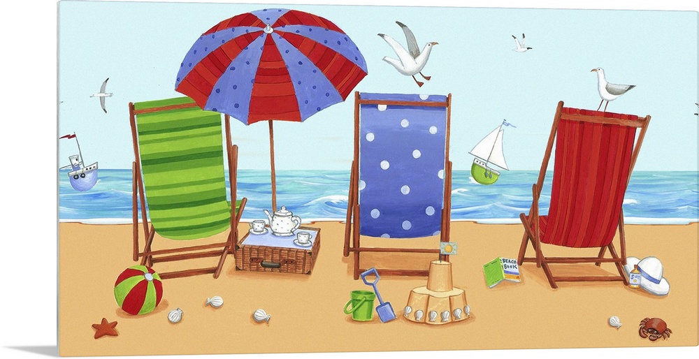 <p>Whimsical colorful beach art of three different colored beach chairs, with the ocean in the background.</p>