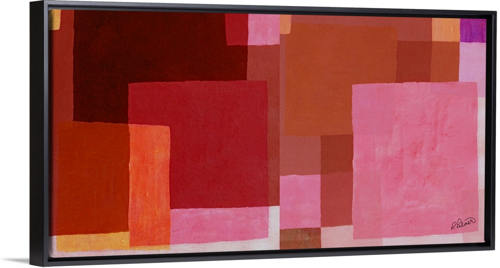 <p>Abstract painting with layered geometric squares in shades of pink, red, orange, and purple.</p>