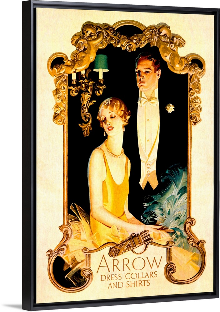<p>This glamorous Art Deco advertisement promotes Arrow Dress Collars and Shirts, a leading American men's fashion brand in the early 20th century. The image shows a poised couple in evening wear-she in a soft yellow gown with pearls, he in a white tie and formal shirt, exuding elegance and sophistication.</p>