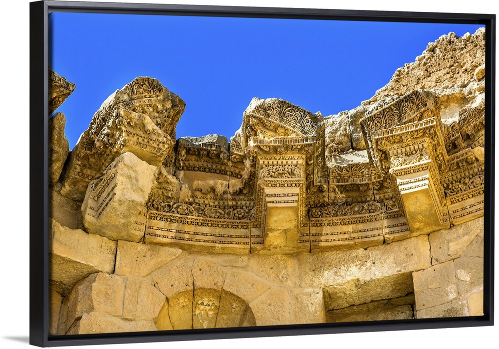 <p>Decorations Nymphaeum Public Fountain Ancient Roman City Jerash Jordan. Jerash came to power 300 BC to 100 AD and was a city through 600 AD. Not conquered until 1112 AD by Crusaders. Famous Trading Center. Most original Roman City in the Middle East.</p>