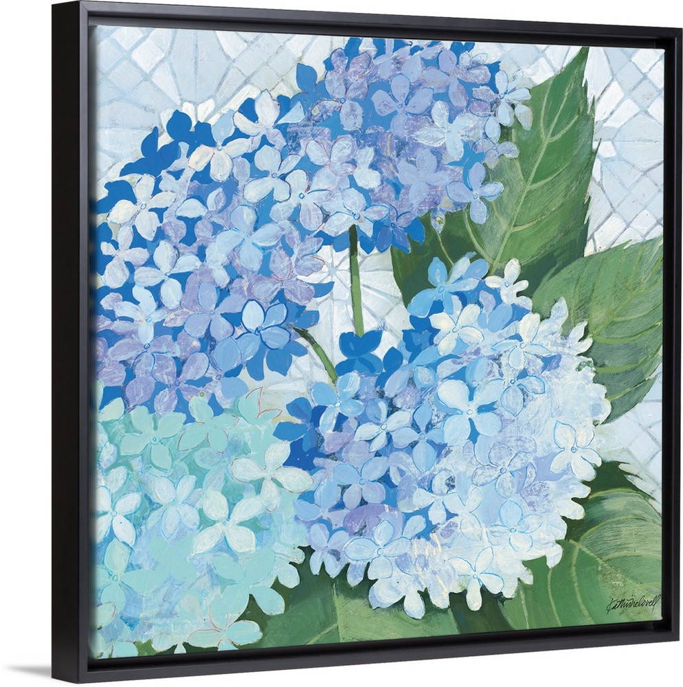 <p>Contemporary artwork of blue flowers close-up in the frame of the image.</p>