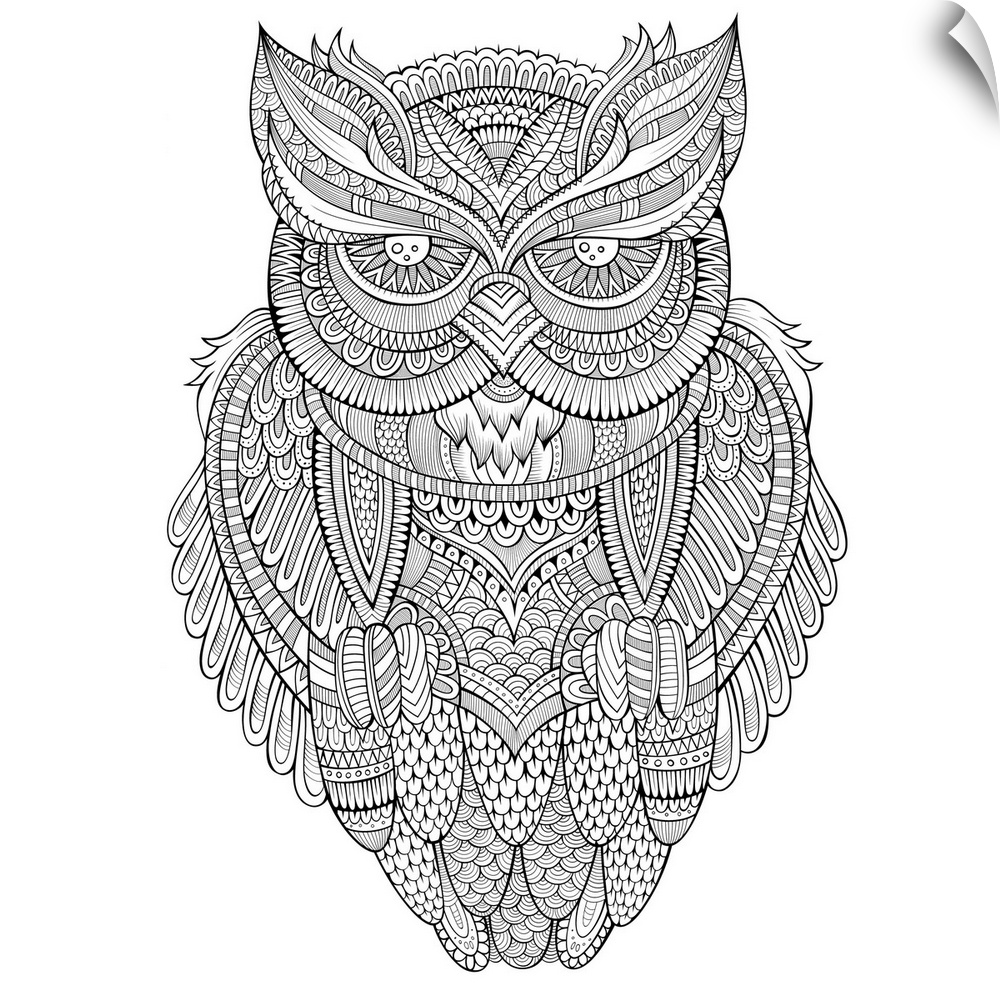 <p>An intricately patterned owl with large eyes and detailed feathers.</p>
