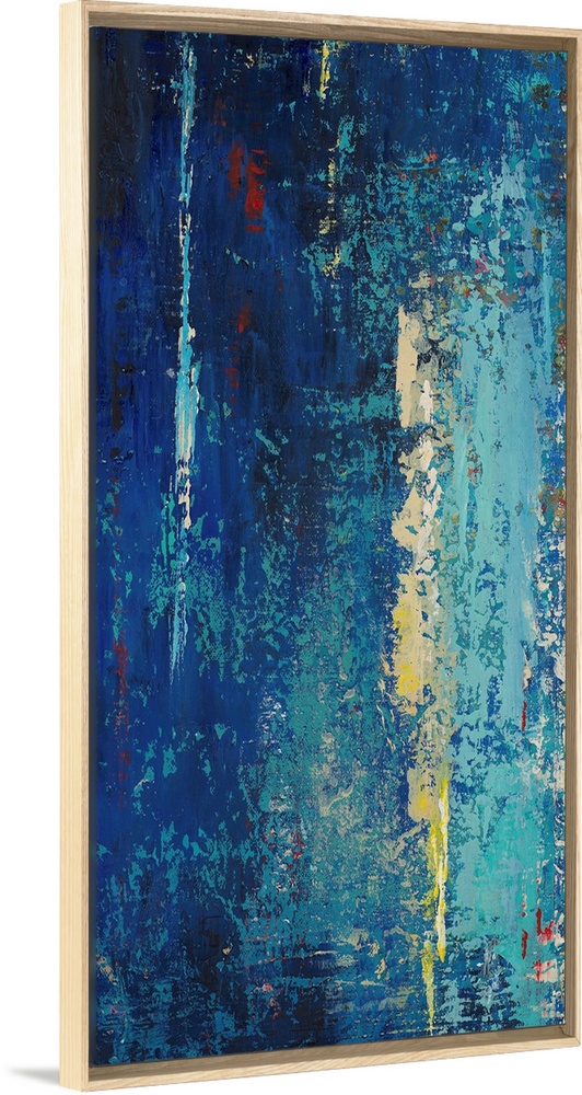 <p>A contemporary abstract painting with dark blues mixed with light blues, yellows and red.</p>