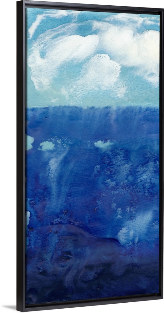 <p>This vertical contemporary artwork features a tumultuous sea with white fluffy clouds floating above.</p>