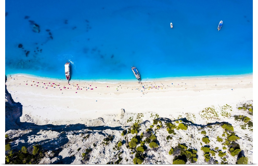 <p>Deep blue waters in Ionian sea with two cruise boats letting tourists enjoy an inaccessible beach.</p>