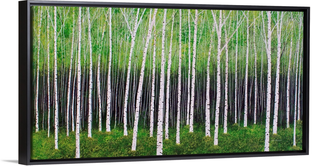 <p>Contemporary painting of lines of trees in a forest with green leaves and grass.</p>