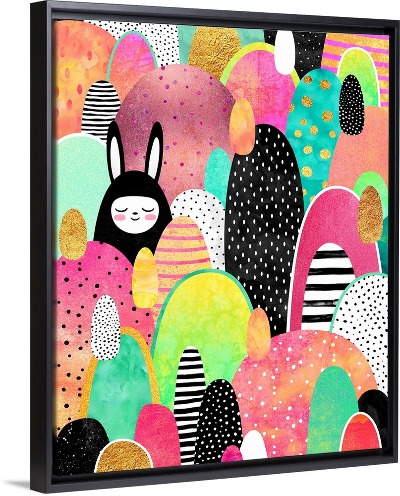 <p>Organic oval shapes in shades of pink, turquiose, black and white with gold accents. One of the shapes is a smiling bunny.</p>