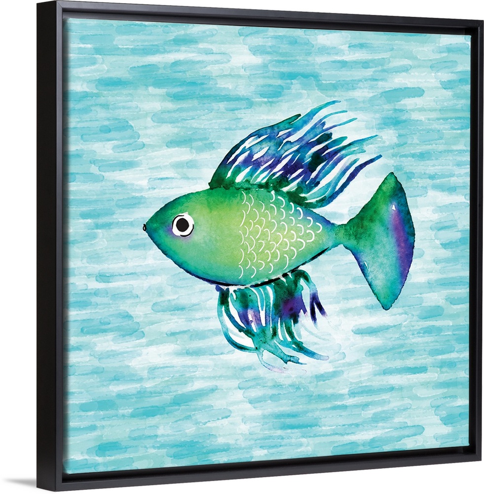 <p>Square illustration of a green, purple, and blue fish swimming in water created with short, horizontal, teal brushstrokes.</p>