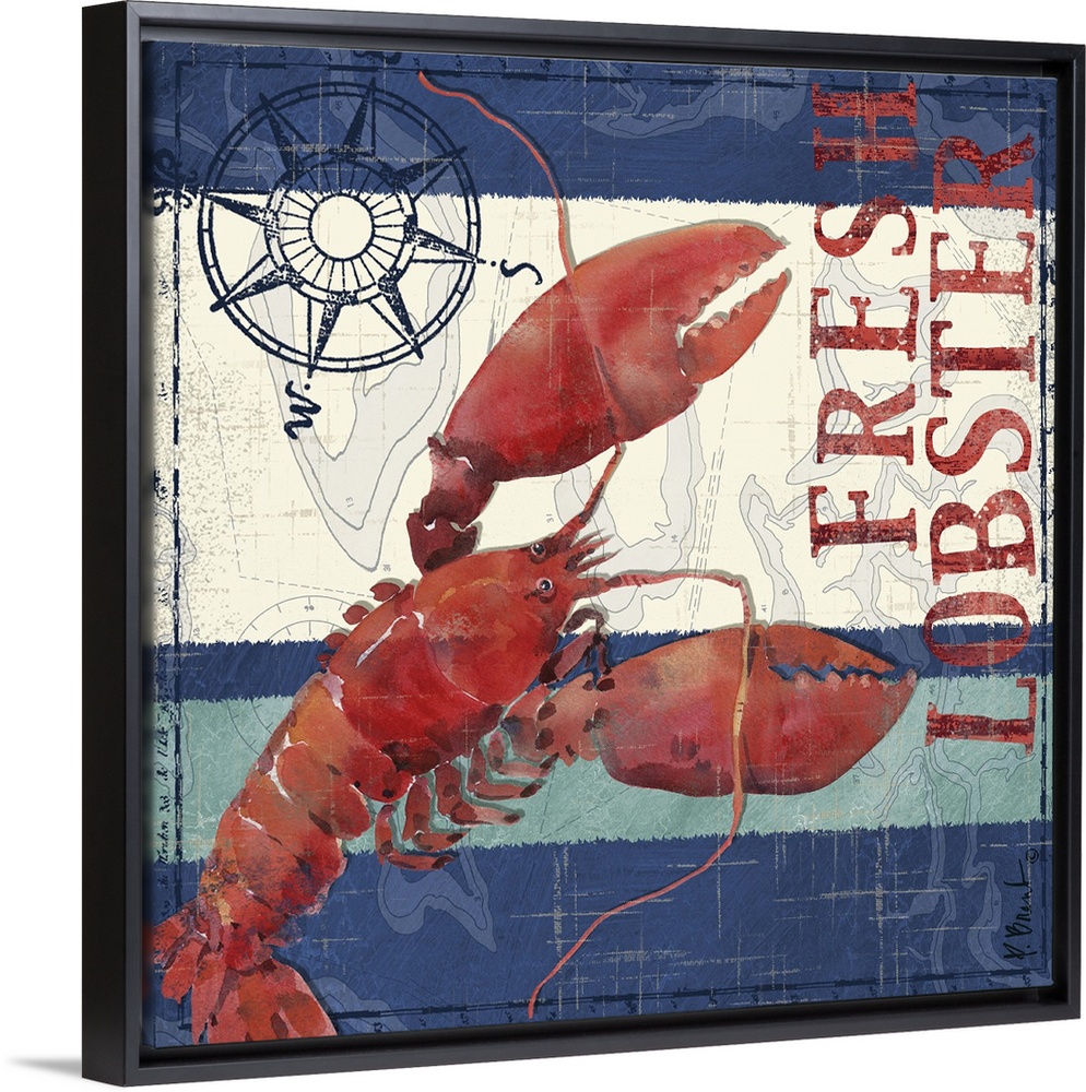 <p>Nautical panel featuring a painting of a lobster with a compass rose graphic element, and the text Fresh Lobster.</p>