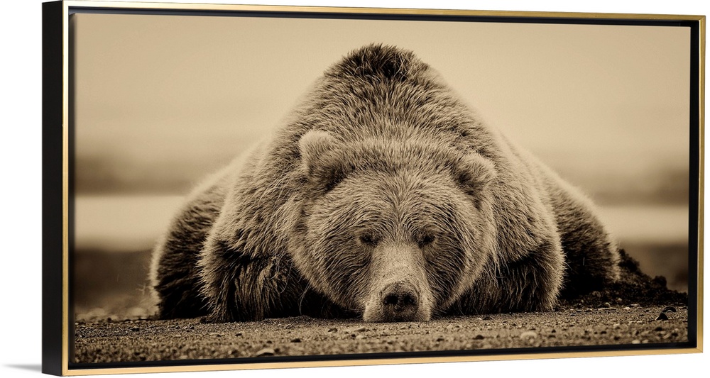 <p>This sepia-toned photograph of a large grizzly bear lying on it's stomach looking directly towards the camera is a true statement piece. The neutral colors would coordinate with most color schemes, and the calm symmetry of the piece would look right at home in a cabin, den or family room.</p>