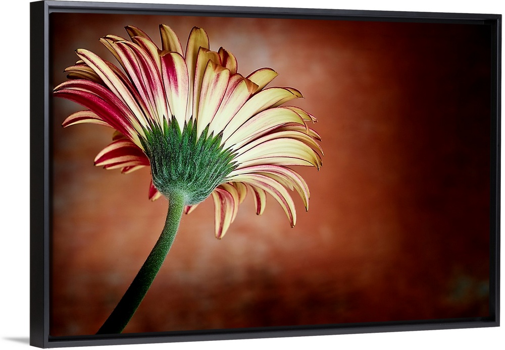<p>A vintage close-up of a daisy flower from below in deep reds and yellows.</p>